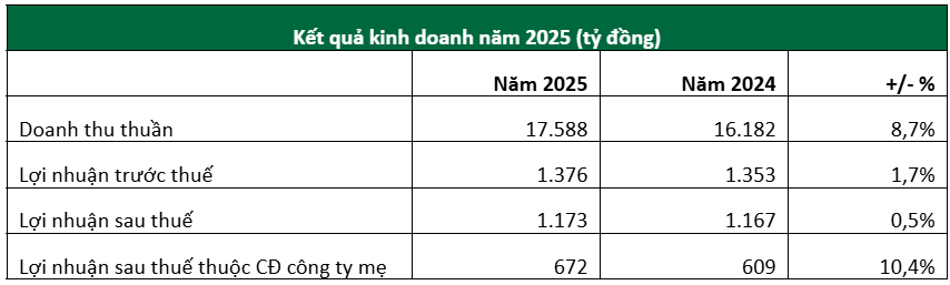margin: 15px auto;" />Lũy kế năm 2025, PAN đạt doanh thu thuần hợp nhất 17.588 tỷ đồng, tăng 8,7% so với năm trước và vượt nhẹ kế hoạch đề ra. Lợi nhuận trước thuế đạt 1.376 tỷ đồng, tăng gần2% so với năm 2024. Đáng chú ý, lợi nhuận sau thuế thuộc về cổ đông công ty mẹ đạt 672 tỷ đồng, tăng 10,4%, phản ánh mức cải thiện rõ nét hơn ở nhóm doanh nghiệp mà PAN nắm tỷ lệ sở hữu chi phối.
