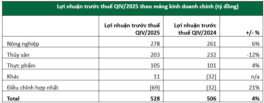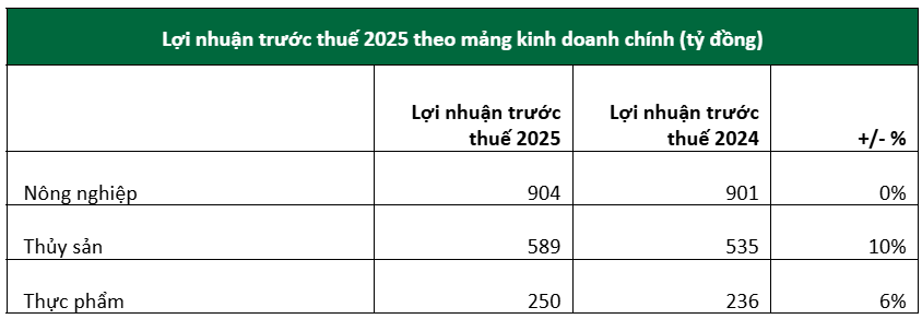 Ở mảng thủy sản, hoạt động sản xuất – tiêu thụ duy trì ổn định, song lợi nhuận quý IV/2025 giảm nhẹ so với cùng kỳ do nền so sánh cao của quý IV/2024. Mảng thực phẩm ghi nhận mức tăng trưởng doanh thu tốt hơn, đóng góp tích cực vào kết quả chung trong quý.