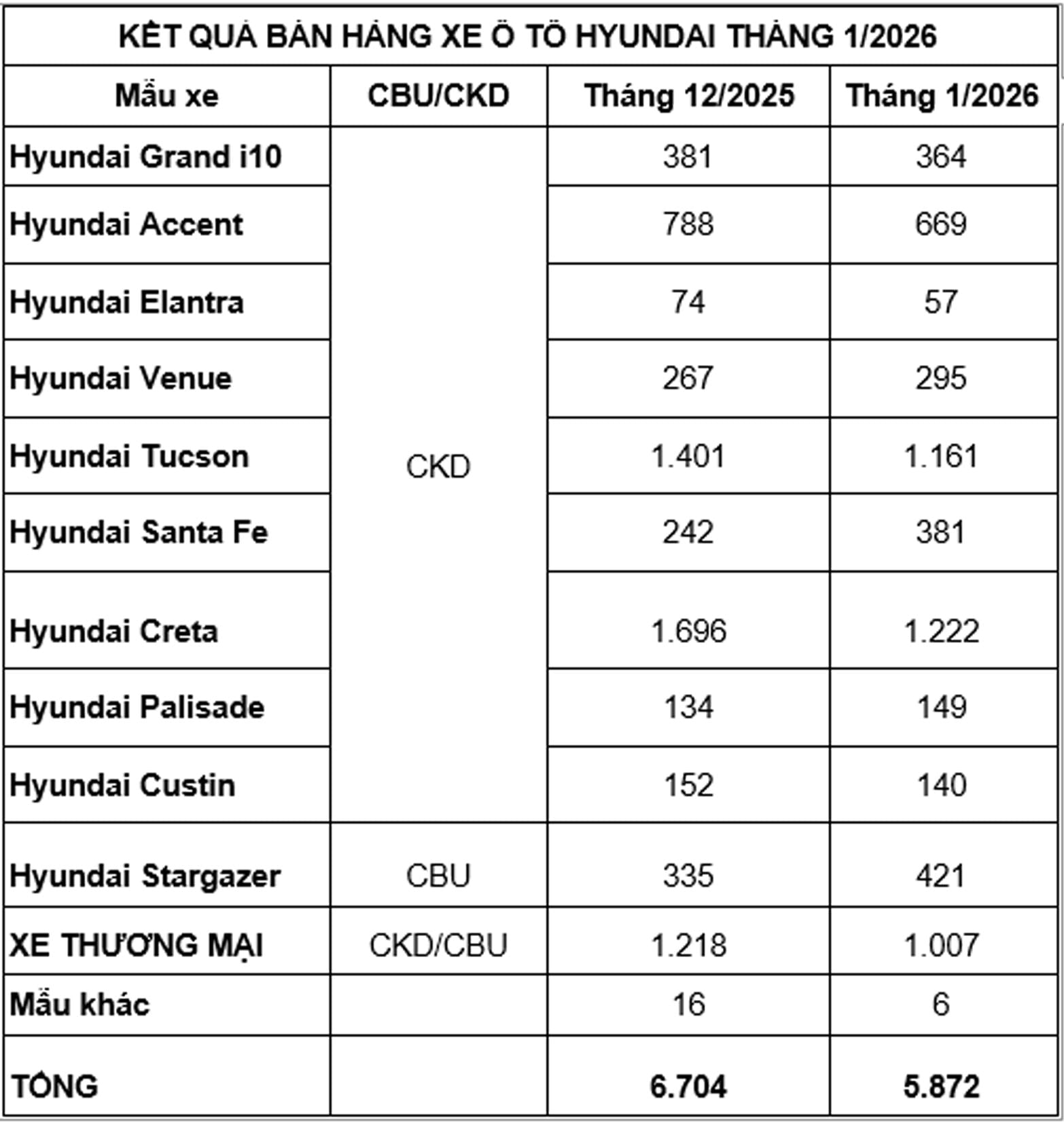 (Banker.vn) Tập đoàn Thành Công (TC GROUP) vừa thông báo kết quả bán hàng tháng 1/2026. Theo đó, tổng doanh số xe Hyundai trong tháng đạt 5.872 xe.