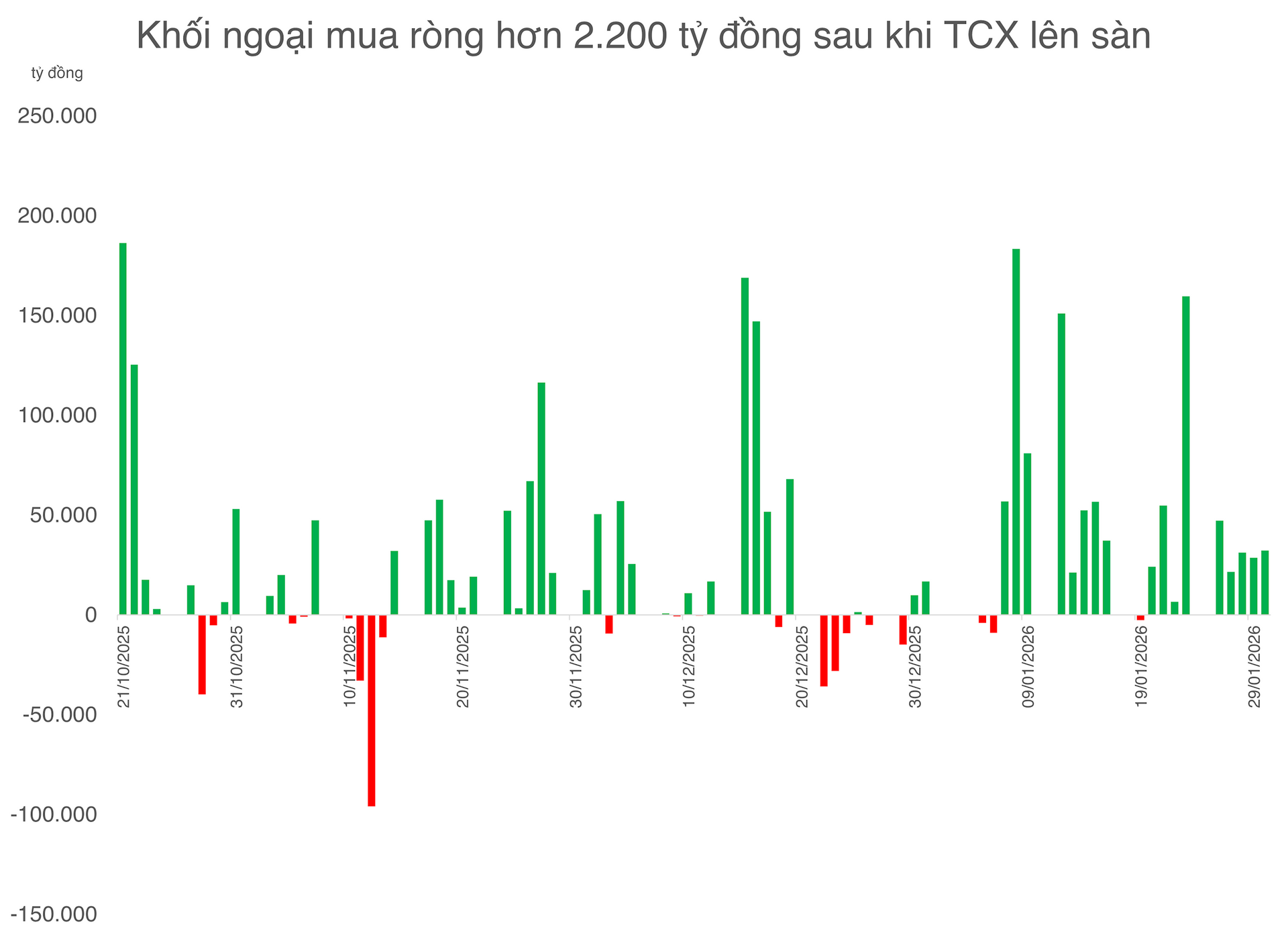 Cùng với đó, từ đầu năm 2026, các nhà đầu tư ngoại đã mua ròng hơn 1.000 tỷ đồng, nằm trong Top 3 cổ phiếu được khối ngoại mua mạnh nhất toàn thị trường. Nếu tính từ ngày chào sàn, khối ngoại đang mua ròng TCX trên 2.200 tỷ đồng.