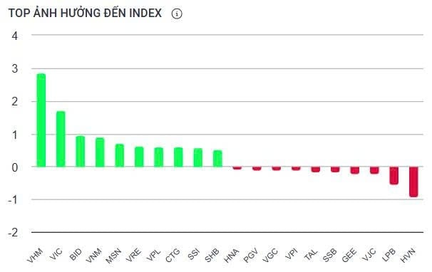 Ở chiều ngược lại, các mã giảm điểm chủ yếu điều chỉnh nhẹ, gồm FPT, GAS, VIB, PLX, SSB, LPB, và VJC – cổ phiếu này chỉ còn giảm chưa đến 1% so với mức giảm hơn 3% trong phiên sáng.