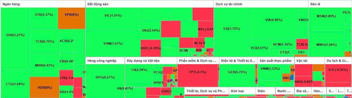 Bên cạnh đó, nhiều bluechip khác cũng đồng loạt tăng như SSI (+3,7%), VNM (+3,3%), SHB (+3%), MSN (+2,9%), trong khi BCM, MWG, BID, SAB, STB, TPB đều tăng từ 1,5–2,5%.