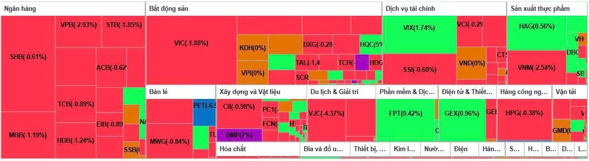 Một số cổ phiếu vốn hóa lớn khác chịu lực bán mạnh như VNM, VPB giảm 2–3%, VJC mất hơn 4% về 188.000 đồng.