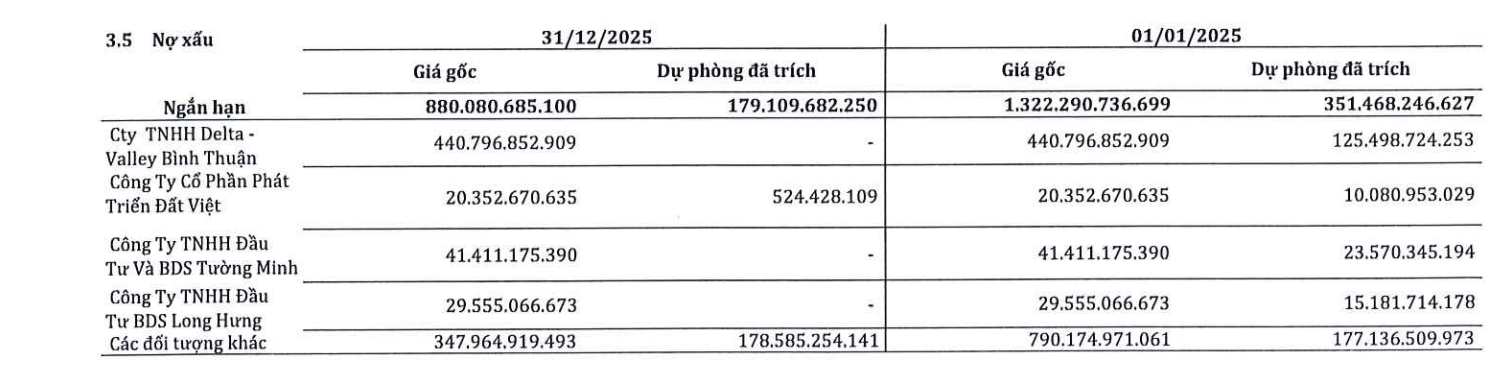 Quá trình xử lý công nợ cũng gặp khó. Tại thời điểm cuối năm 2025, dự phòng phải thu ngắn hạn khó đòi giảm mạnh 351,5 tỷ đồng xuống còn 179,1 tỷ đồng, trong khi chi phí xây dựng cơ bản dở dang tăng lên 316,6 tỷ đồng, chủ yếu là giá trị bất động sản nhận về từ việc hoán đổi các khoản NHNN.">nợ xấu.