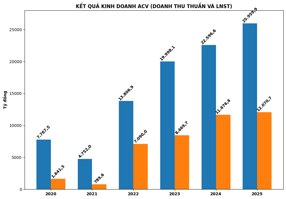 Lũy kế cả năm 2025, ACV ghi nhận doanh thu khoảng 26 nghìn tỷ đồng, tăng 15% so với năm trước, trong khi lợi nhuận sau thuế đạt khoảng 12,1 nghìn tỷ đồng, tăng 4%.