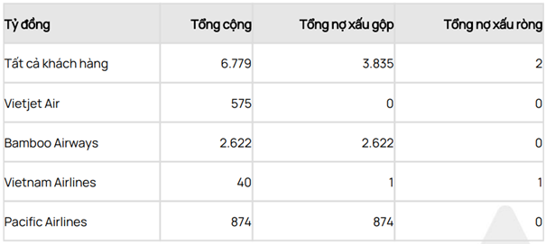 Bamboo Airways chiếm phần lớn với khoảng 2.622 tỷ đồng, trong khi Pacific Airlines ghi nhận khoảng 874 tỷ đồng, cho thấy rủi ro tín dụng vẫn hiện hữu khi một số hãng hàng không chưa hoàn toàn phục hồi tài chính.
