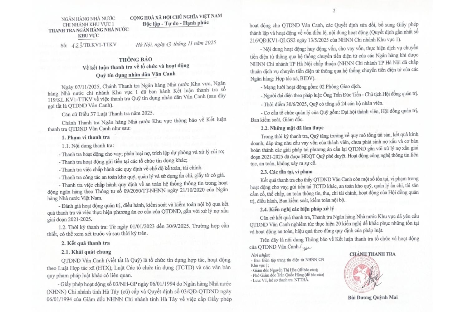 Thanh tra Ngân hàng Nhà nước chỉ ra loạt vấn đề tại Quỹ tín dụng Vân Canh<#h1>Bài cùng chuyên mục