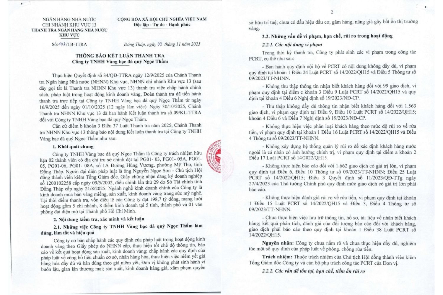 Thanh tra Ngân hàng Nhà nước chỉ rõ hàng loạt vi phạm về phòng chống rửa tiền tại hai công ty vàng lớn<#h1>Bài cùng chuyên mục