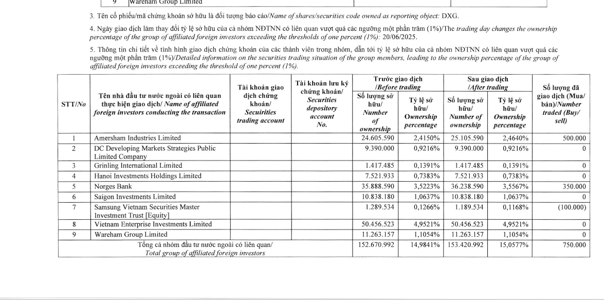 (Banker.vn) Trước đó, tháng 6/2025, Dragon Capital sở hữu hơn 15% vốn DXG. Sau nhiều lần "xả hàng", tỷ lệ sở hữu của quỹ ngoại tại DXG hiện giảm xuống dưới 8%.