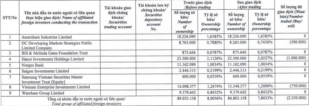 Cụ thể, DC Developing Markets Strategies Public Limited Company bán 500.000 cổ phiếu; Hanoi Investments Holdings Limited bán 1 triệu cổ phiếu; Vietnam Enterprise Investments Limited bán 750.000 cổ phiếu.
