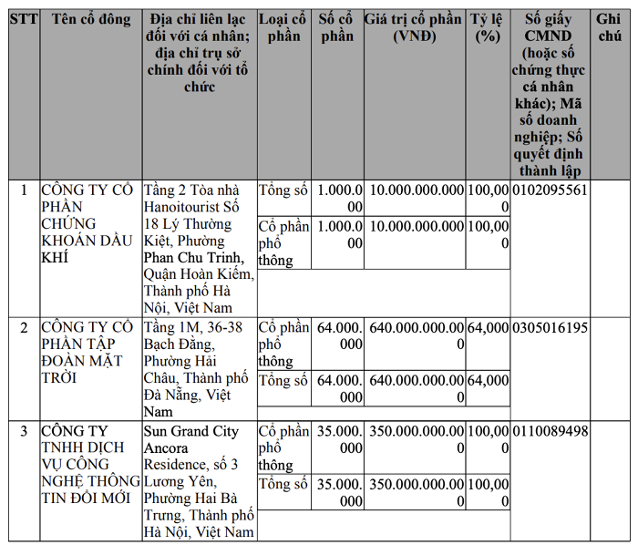 Công ty có vốn điều lệ ban đầu 1.000 tỷ đồng. Trong đó, cổ đông lớn nhất là Công ty CP Tập đoàn Mặt Trời (Sun Group) với tỷ lệ góp vốn 64%, tương đương 640 tỷ đồng. Công ty TNHH Dịch vụ Công nghệ thông tin Đổi mới nắm giữ 35% vốn, trong khi Công ty CP Chứng khoán Dầu khí (HNX: PSI) sở hữu 1% còn lại.