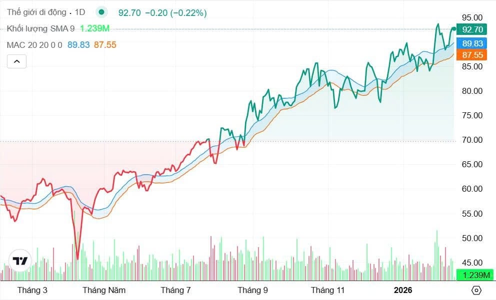 Diễn biến giá cổ phiếu MWG trên thị trường vẫn duy trì xu hướng tích cực. Chốt phiên ngày 12/2, cổ phiếu MWG dừng ở mức 92.900 đồng/cổ phiếu, tăng khoảng 4% so với thời điểm nhóm quỹ giảm tỷ lệ nắm giữ. Trong vòng một năm qua, thị giá MWG đã tăng hơn 60%, phản ánh sự phục hồi rõ nét của doanh nghiệp.