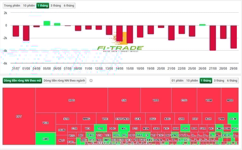 Trong khi dòng vốn nội vẫn là động lực chính, khối ngoại biến động khó lường. Ngày 26/8, khối ngoại bất ngờ mua ròng gần 1.000 tỷ đồng, nhưng hôm sau đảo chiều bán ròng hơn 4.000 tỷ đồng, tập trung vào ngân hàng, thép, chứng khoán. Ngày 28/8, áp lực bán tiếp tục với hơn 2.500 tỷ đồng, khiến dòng vốn nội phải hấp thụ để giữ nhịp thị trường.