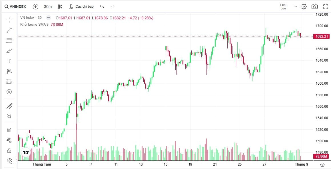 Thanh khoản thị trường chứng khoán Việt Nam tháng 8 tăng trưởng vượt bậc, nhiều phiên giao dịch đạt 40.000–70.000 tỷ đồng, đỉnh điểm là ngày 5/8 với giá trị kỷ lục 85.800 tỷ đồng. VN-Index liên tục duy trì vùng 1.670–1.680 điểm và áp sát mốc 1.700. Sự bùng nổ này xuất phát chủ yếu từ dòng vốn nội, khi riêng tháng 7 đã có hơn 226.000 tài khoản chứng khoán cá nhân mở mới, đưa tổng số tài khoản vượt 10,4 triệu.