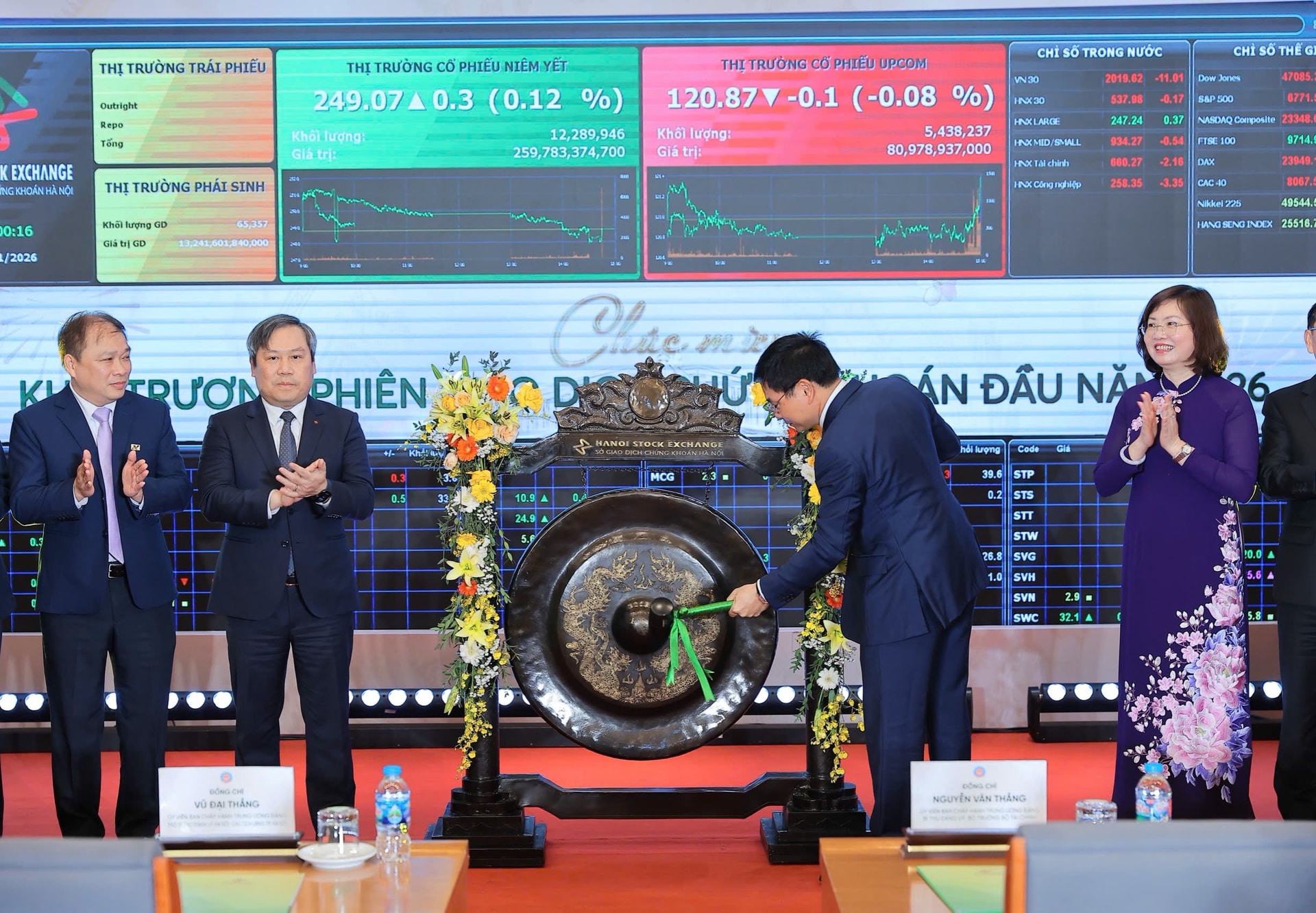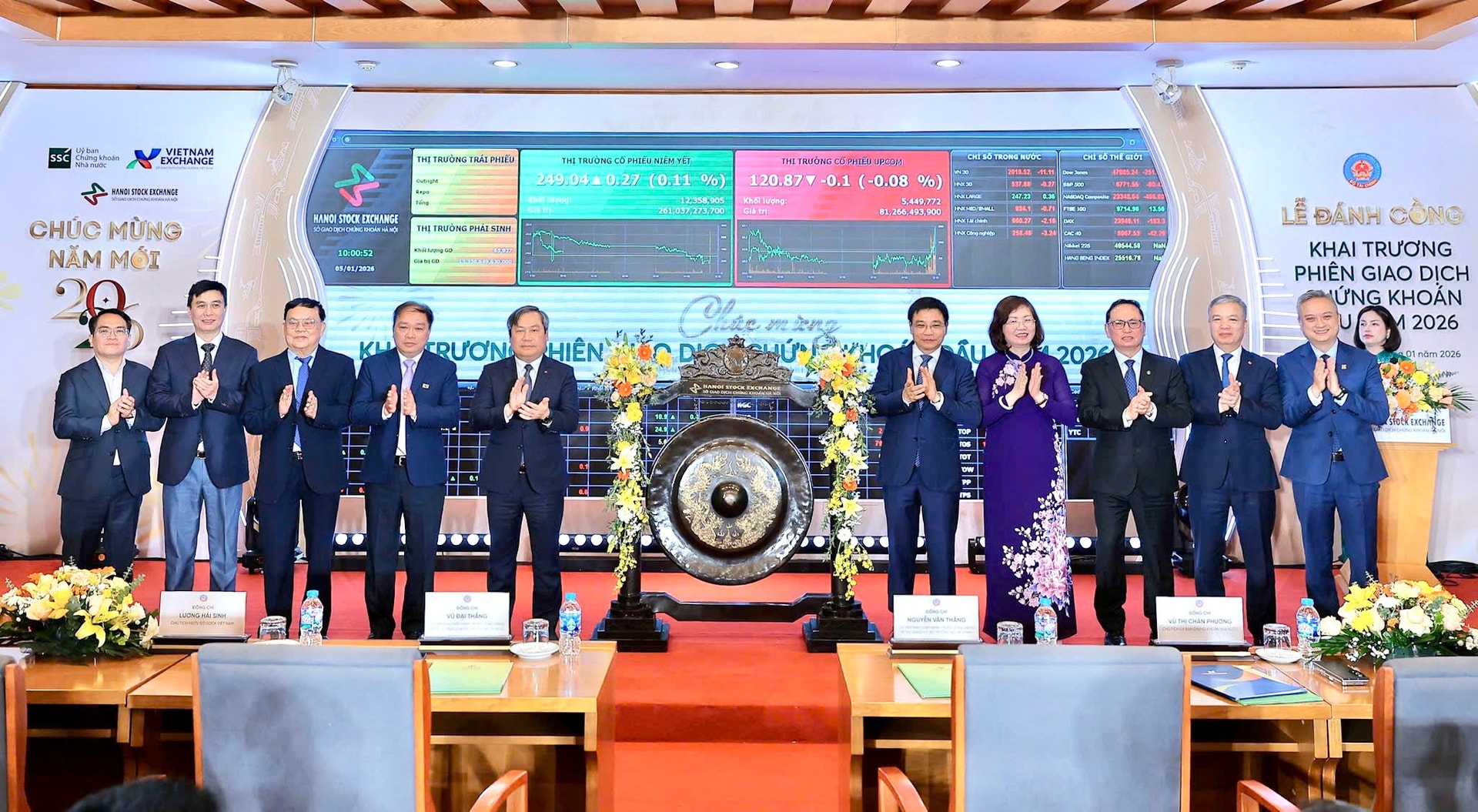 (Banker.vn) Sáng ngày 05/01, Lễ đánh cồng khai trương phiên giao dịch chứng khoán đầu năm 2026 được tổ chức tại Sở Giao dịch Chứng khoán (GDCK) Hà Nội. Đây là buổi lễ truyền thống được tổ chức hàng năm vào ngày giao dịch chứng khoán đầu tiên của năm mới nhằm khích lệ tinh thần các nhà đầu tư, cộng đồng doanh nghiệp và các thành viên thị trường.
