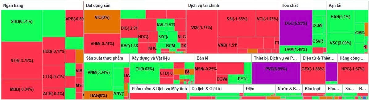 Cổ phiếu VNM cũng giao dịch bứt phá, tăng 3,3% lên 61.800 đồng/CP với gần 10 triệu đơn vị khớp lệnh, trái ngược với diễn biến điều chỉnh của nhóm ngân hàng. Ở chiều ngược lại, STB tiếp tục “gánh” lực bán mạnh nhất nhóm bank với mức giảm 3,8%, trong khi VRE và TPB cũng lùi nhẹ.