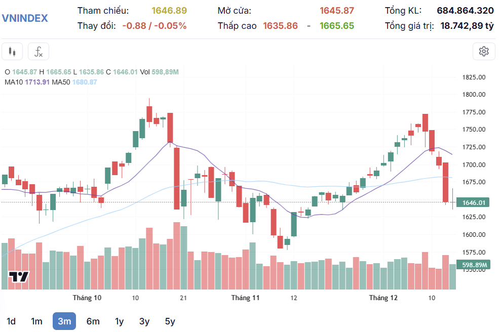 Kết thúc phiên giao dịch, sàn HOSE có 126 mã tăng và 188 mã giảm, VN-Index giảm nhẹ 0,88 điểm (-0,05%), xuống 1.646,01 điểm. Tổng khối lượng giao dịch đạt 684,9 triệu đơn vị, giá trị đạt 18.742 tỷ đồng, cùng giảm hơn 24% cả về khối lượng và giá trị so với phiên cuối tuần trước. Giao dịch thỏa thuận đóng góp gần 86 triệu đơn vị, giá trị đạt 2.897,2 tỷ đồng.