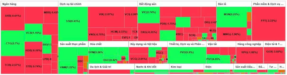 Tương tự, nhóm bất động sản cũng suy yếu rõ rệt, chỉ còn khoảng 10 mã tăng giá. Ngoài VIC, phần lớn cổ phiếu đều điều chỉnh: KHG giảm mạnh 5,7%, hơn 15 mã khác giảm trên 2%, cho thấy dòng tiền đang tạm thời rời bỏ nhóm này sau chuỗi tăng mạnh trước đó.