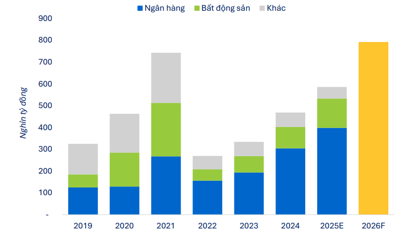 Sự phục hồi rõ nét với tổng phát hành ước đạt 644 nghìn tỷ đồng, tăng 32% so với 2024. Quy mô này chỉ nhỏ hơn chút đỉnh cao năm 2021 với tổng giá trị phát hành hơn 750 nghìn tỷ đồng trước khi đi vào giai đoạn điều chỉnh.