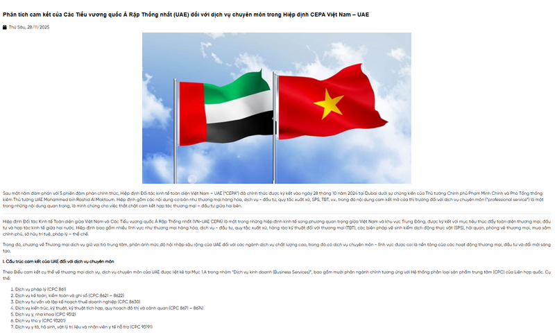 Hiệp định CEPA gồm các nội dung cơ bản như thương mại hàng hóa, dịch vụ - đầu tư, quy tắc xuất xứ, SPS, TBT... trong đó nội dung cam kết mở cửa thị trường đối với dịch vụ chuyên môn (“professional service”) là một trong những nội dung quan trọng, là minh chứng cho việc thắt chặt cam kết hợp tác thương mại - đầu tư giữa Việt Nam - UAE.