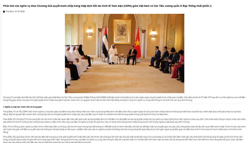 Từ thông tin các bài viết cập nhật trên Cổng FTAP về Hiệp định CEPA, nhìn chung, cam kết của UAE với Việt Nam đã phản ánh mô hình hội nhập tiến bộ, linh hoạt và cân bằng, vừa thúc đẩy tự do hóa thị trường, vừa bảo đảm lợi ích công cộng.