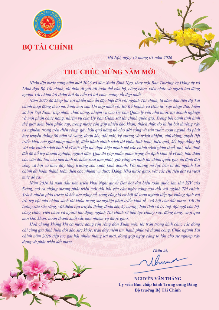 Trong Thư chúc mừng năm mới, Bộ trưởng Bộ Tài chính Nguyễn Văn Thắng cho biết, năm 2026 là năm đầu tiên triển khai Nghị quyết Đại hội đại biểu toàn quốc lần thứ XIV của Đảng, mở ra chặng đường phát triển mới đòi hỏi yêu cầu ngày càng cao đối với ngành Tài chính. Trách nhiệm phía trước là hết sức nặng nề, song cũng là cơ hội để toàn ngành tiếp tục khẳng định vai trò trụ cột của chính sách tài khóa trong sự nghiệp phát triển kinh tế - xã hội của đất nước.