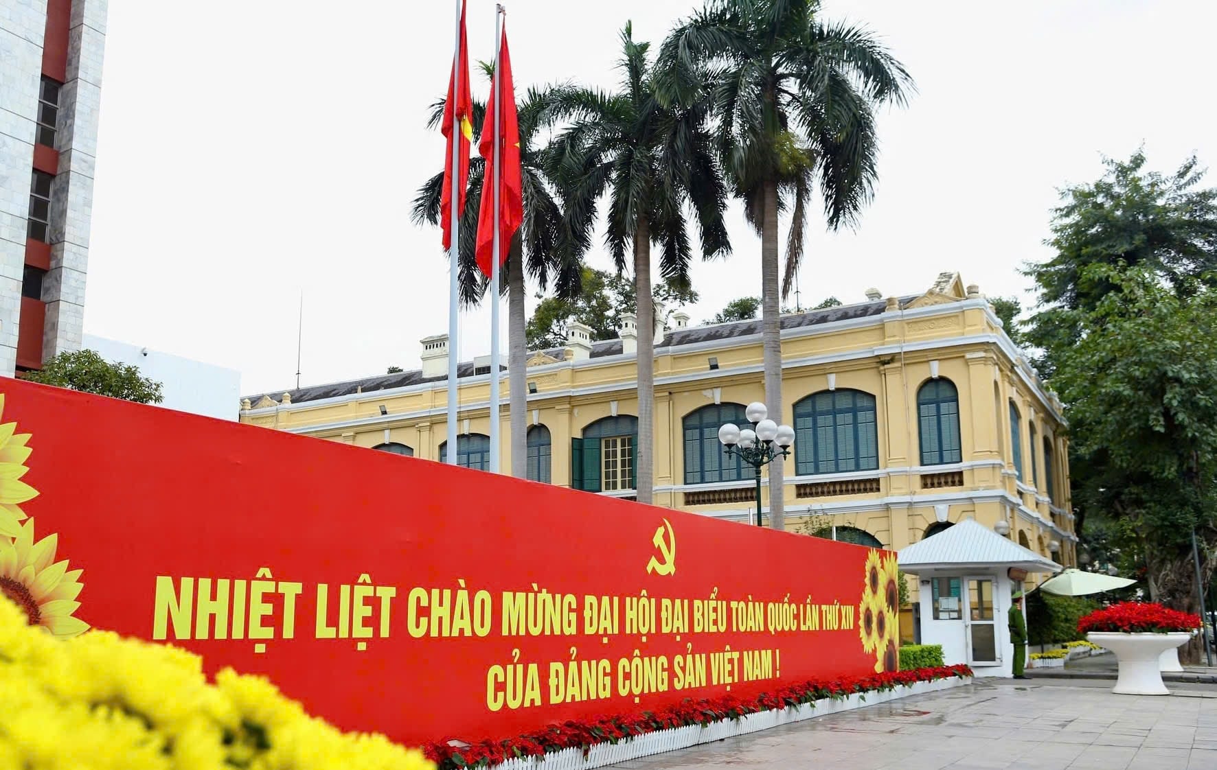 margin: 15px auto;" />Tại các khu vực trọng điểm như Quảng trường Ba Đình, khu vực Hồ Hoàn Kiếm, và các trục đường lớn như Hùng Vương, Phan Đình Phùng, Điện Biên Phủ... những cụm pano pano tấm lớn, biểu ngữ và biểu tượng hình búa liềm được dựng lên trang trọng. Màu đỏ của lá cờ Tổ quốc, cờ Đảng kết hợp cùng sắc vàng của biểu tượng Đại hội XIV tạo nên một không gian đầy tự hào và phấn khởi.