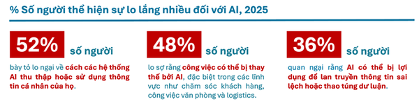 Mức độ quan tâm cao cũng đi kèm với những nỗi lo đáng lưu ý. Theo khảo sát, tại Việt Nam, cũng như các nước châu Á - Thái Bình Dương khác, quyền riêng tư dữ liệu là mối lo ngại lớn nhất, với 52% người được khảo sát bày tỏ sự lo lắng về cách AI thu thập và sử dụng dữ liệu cá nhân.