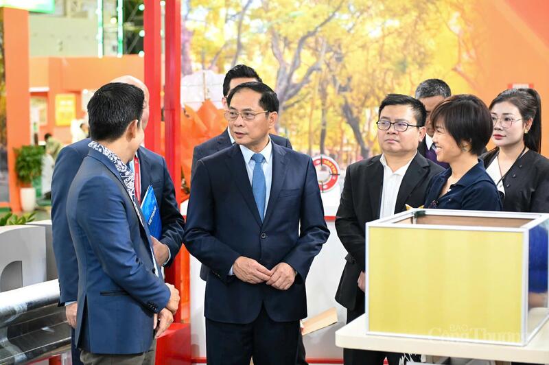 Phó Thủ tướng và đoàn công tác kiểm tra tình hình triển khai các gian trưng bày của địa phương, doanh nghiệp. Ảnh: Bùi Giang
