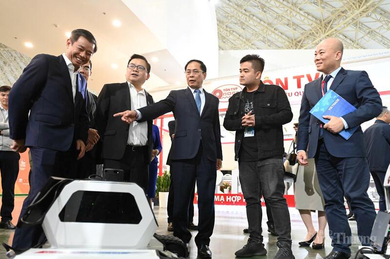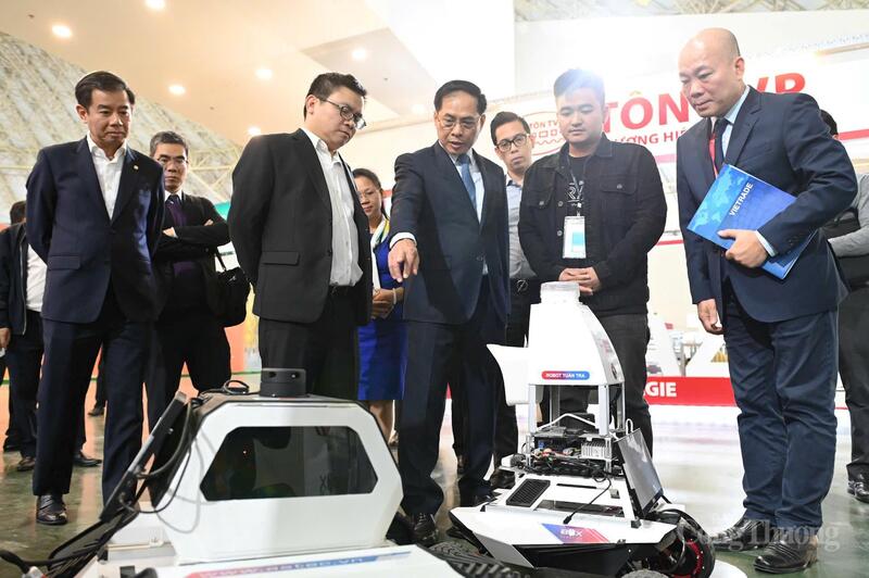 Phó Thủ tướng thăm mô hình robot của một doanh nghiệp. Ảnh: Bùi Giang