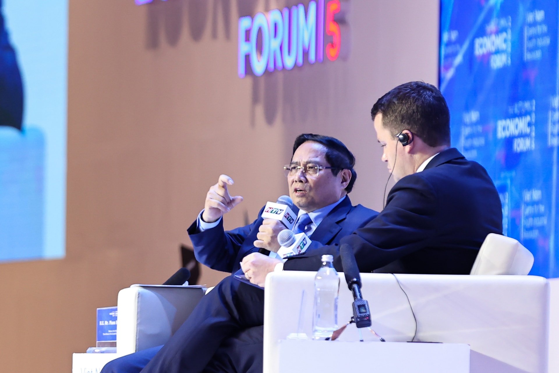 Trong câu hỏi thứ ba, điều phối viên đề nghị Thủ tướng chia sẻ về vai trò của chuyển đổi kép (chuyển đổi số, chuyển đổi xanh) đối với Việt Nam.<#p>