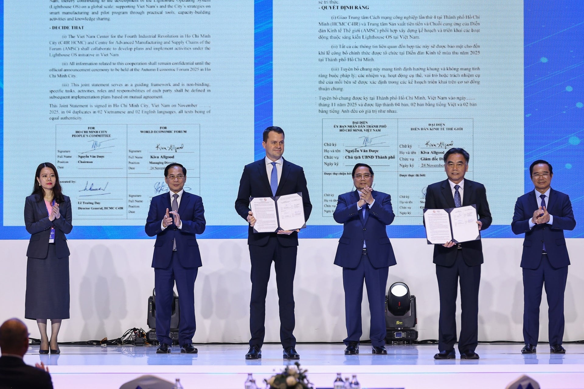 <#div>Thủ tướng Chính phủ chứng kiến trao Bản ghi nhớ (MOU) về hợp tác giữa TPHCM và Diễn đàn Kinh tế Thế giới (WEF) về sáng kiến thúc đẩy sản xuất thông minh và chuyển đổi công nghiệp có trách nhiệm tại Việt Nam - Ảnh: VGP<#span><#figcaption><#figure>