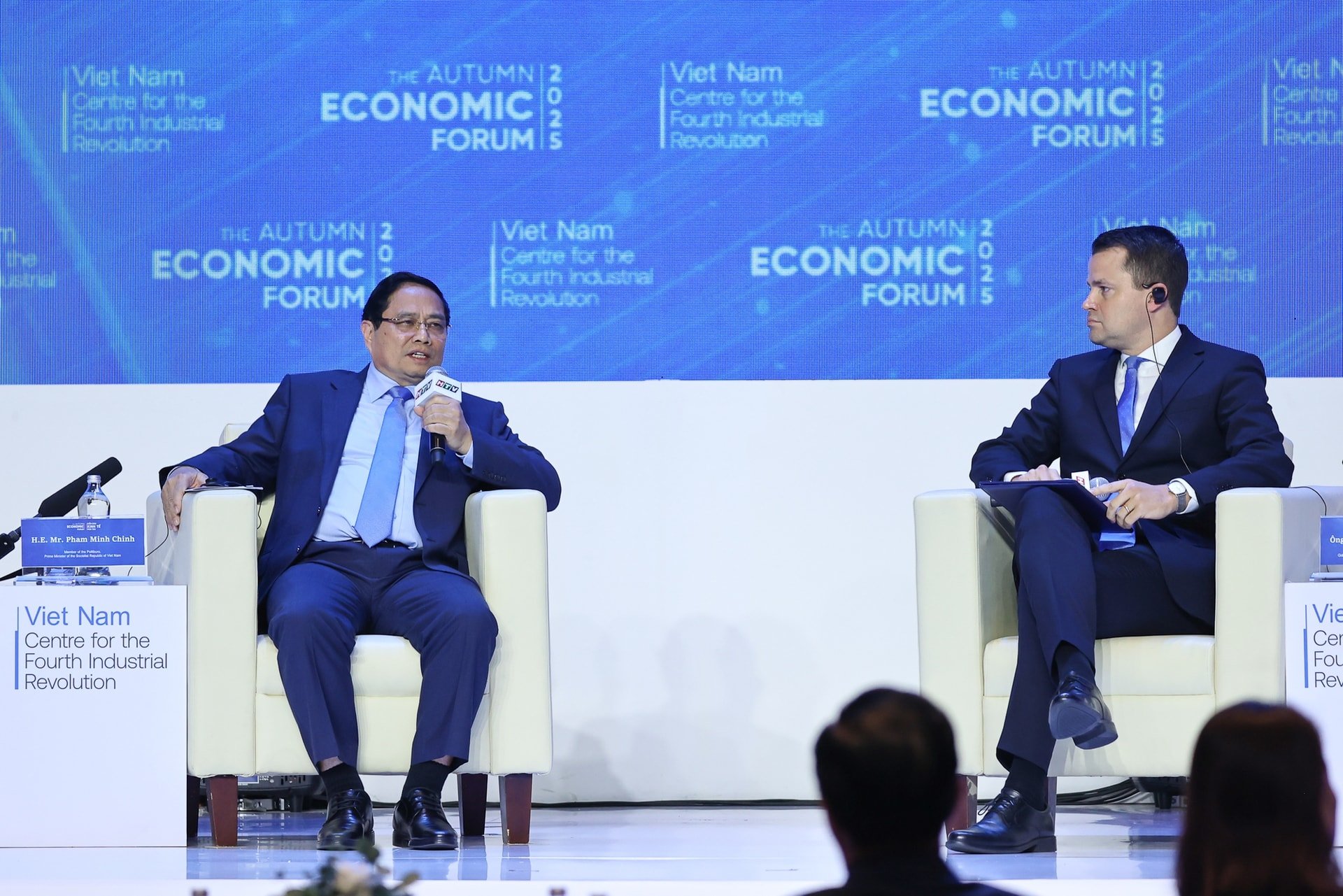Chiều 26#11, tại TPHCM, sự kiện tâm điểm, điểm nhấn đặc biệt trong chương trình Diễn đàn Kinh tế mùa Thu năm 2025 - phiên đối thoại chính sách cấp cao giữa Thủ tướng Chính phủ Phạm Minh Chính với lãnh đạo Diễn đàn Kinh tế Thế giới đã diễn ra về chủ đề "Chuyển đổi kép từ chiến lược đến hành động - Định hình Việt Nam trong kỷ nguyên vươn mình".<#p><#div>