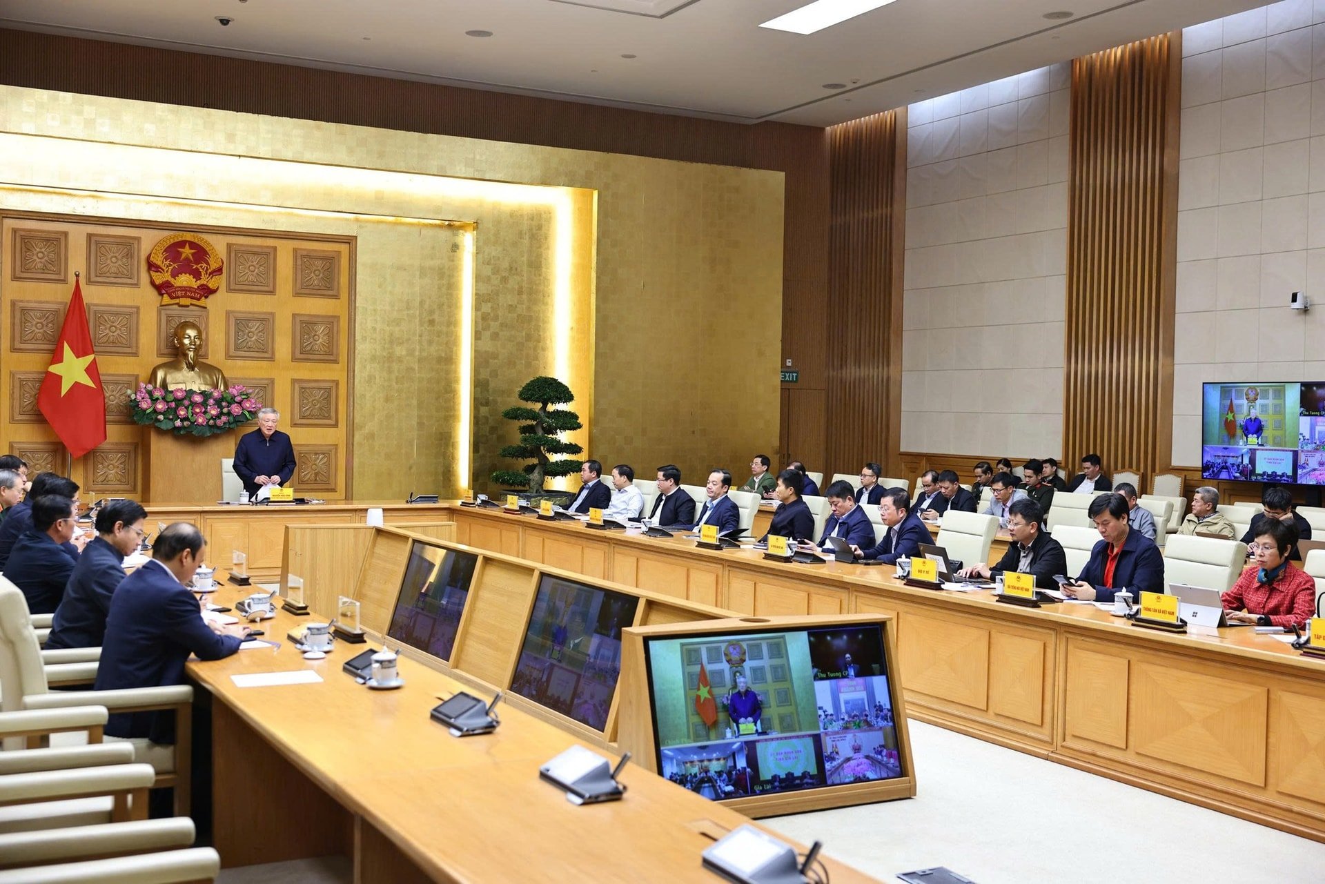 Phó Thủ tướng Thường trực Chính phủ Nguyễn Hòa Bình dự tại điểm cầu trụ sở Chính phủ, Phó Thủ tướng Chính phủ Hồ Quốc Dũng dự tại điểm cầu trụ sở UBND tỉnh Khánh Hòa, lãnh đạo Ban Chỉ đạo phòng thủ dân sự quốc gia, các bộ ngành, địa phương tham dự họp tại các điểm cầu trong nước.