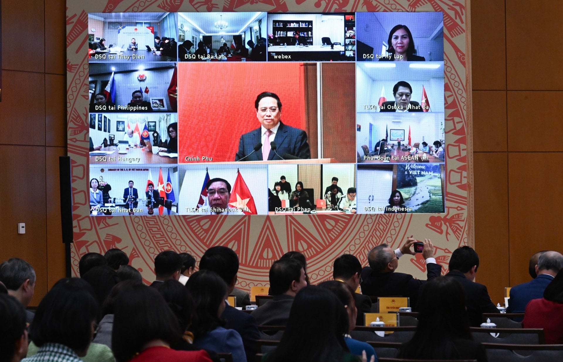 margin: 15px auto;" />Hội nghị được tổ chức tại Trụ sở Chính phủ, trực tuyến với 98 cơ quan đại diện Việt Nam tại nước ngoài. Cùng dự hội nghị có: Bí thư Trung ương Đảng, Bộ trưởng Bộ Ngoại giao Lê Hoài Trung; Phó Thủ tướng Chính phủ Bùi Thanh Sơn; lãnh đạo các ban, bộ, ngành Trung ương và địa phương.