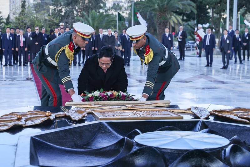 Thủ tướng Phạm Minh Chính đặt vòng hoa tại Đài Tưởng niệm liệt sĩ Algeria, thăm Bảo tàng Cựu chiến binh quốc gia Algeria. Ảnh: VGP/Nhật Bắc