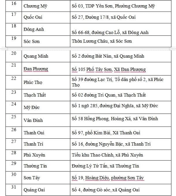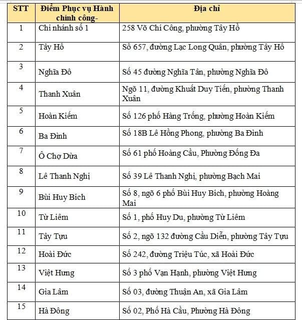 Danh sách 31 Điểm Phục vụ hành chính công tiếp nhận TTHC thuế trên địa bàn: