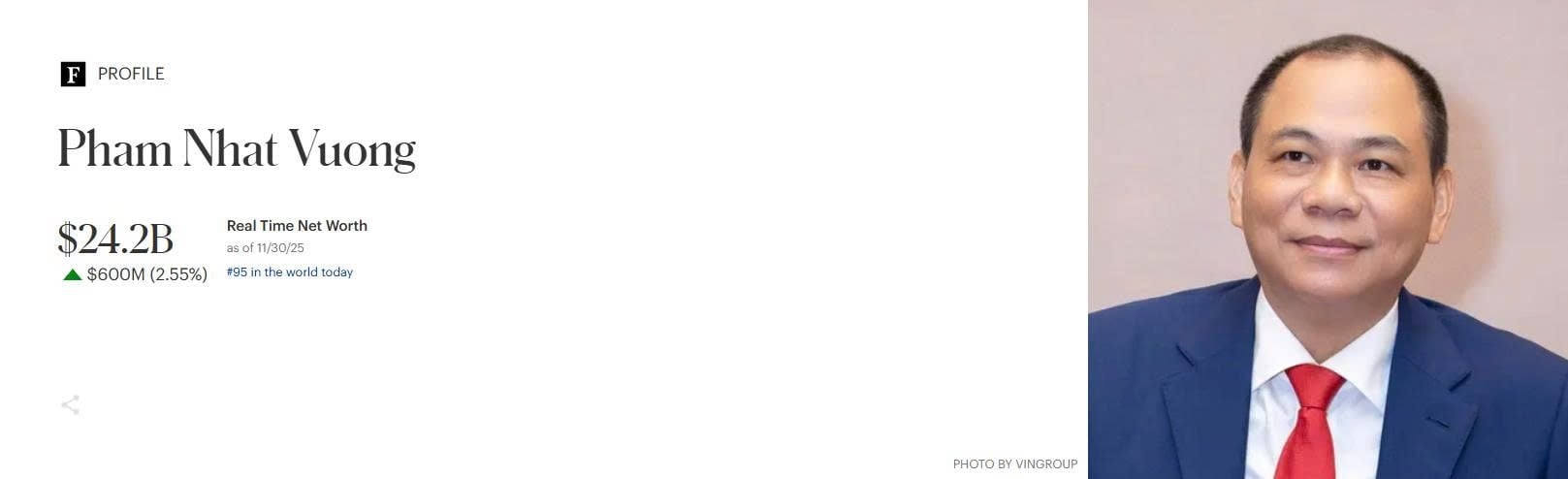 Đà tăng phi mã của VIC cũng kéo theo sự mở rộng đáng kể trong tài sản của Chủ tịch Phạm Nhật Vượng. Theo thống kê của Forbes, giá trị tài sản quy đổi hiện đã vượt 24 tỷ USD nhờ phần cổ phiếu nắm giữ trực tiếp cùng lượng cổ phiếu được góp vốn vào các công ty thành viên của hệ sinh thái.