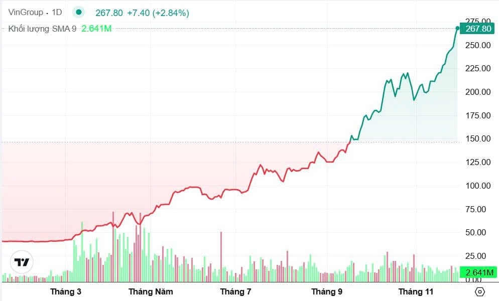Phiên giao dịch sáng đầu tuần 1/12 ghi nhận thêm một nhịp bứt phá mạnh của cổ phiếu VIC nhà Tập đoàn Vingroup khi thị giá có thời điểm leo thẳng lên mức kịch trần trước khi hạ nhiệt về vùng tăng quanh 3%. Dù điều chỉnh nhẹ, cổ phiếu vẫn duy trì mức trên 267.000 đồng/cp, đánh dấu chuỗi 11 phiên tăng liên tục với tổng biên độ hơn 23%.