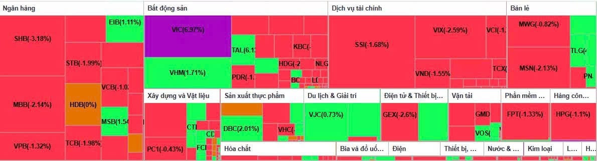 Trái lại, nhóm cổ phiếu thuộc hệ sinh thái Vingroup ghi nhận áp lực chốt lời mạnh. VIC giảm gần 1%, VHM mất 1,5% còn VRE cũng lùi nhẹ. Nhóm này đã tăng khá tốt trong thời gian trước đó, nên việc điều chỉnh được xem là động thái kỹ thuật bình thường. Ngược lại, nhóm bất động sản còn lại giao dịch khá khởi sắc với DXG, PDR, DIG, VPI hay KBC tăng từ 2–3%.