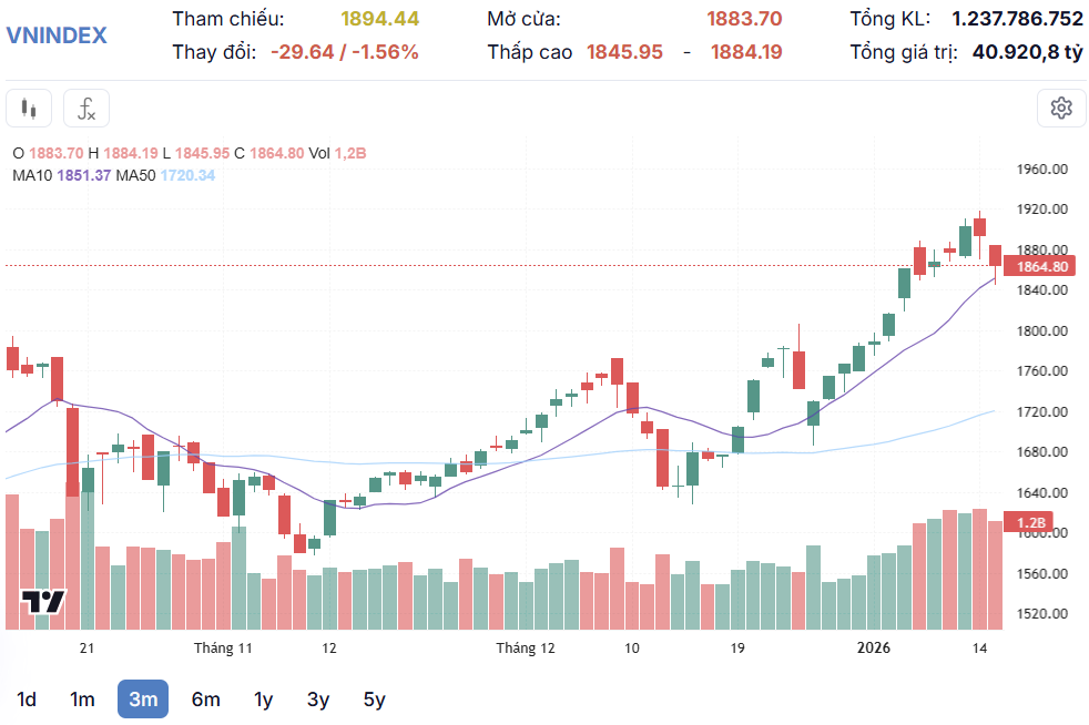 Kết thúc phiên giao dịch, VN-Index giảm 29,64 điểm (-1,56%) xuống 1.864,8 điểm với 177 mã tăng (14 mã tăng trần) và 147 mã giảm (2 mã giảm sàn). Tổng khối lượng giao dịch đạt 1,24 tỷ đơn vị, giá trị đạt 40.920,8 tỷ đồng, giảm trên dưới 12% về khối lượng và giá trị so với phiên hôm qua. Trong đó, giao dịch thỏa thuận đóng góp hơn 39 triệu đơn vị, giá trị đạt 1.383,8 tỷ đồng.