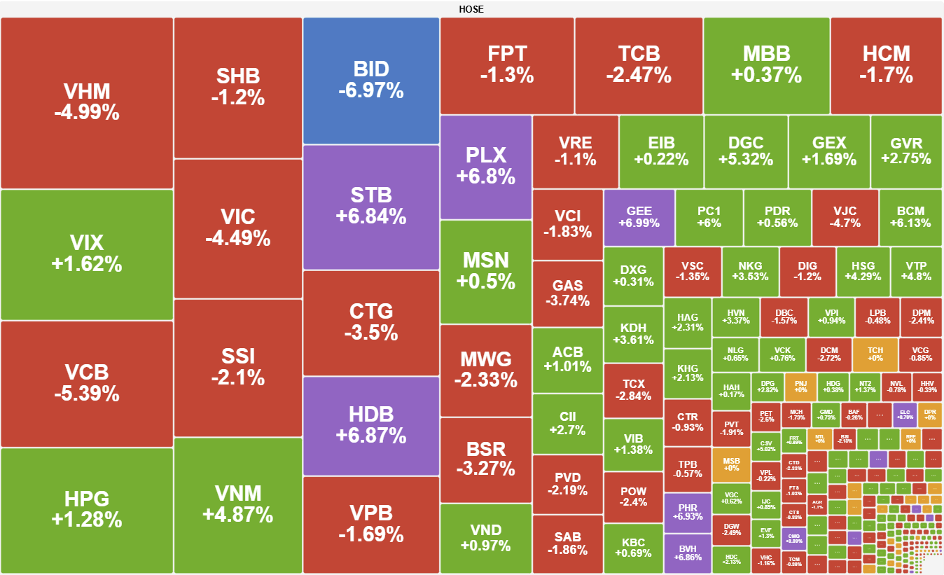 Bước sang phiên chiều, thị trường tiếp tục chịu thử thách khi các "trụ" lớn như VCB, BID, CTG bị bán mạnh. Dẫu vậy, dòng tiền không rời bỏ thị trường mà luân chuyển sang các mã riêng lẻ, giúp STB và HDB bứt phá tăng trần, cùng sự hỗ trợ từ HPG. Sự kiên trì của các mã VNM, GVR, PLX đã giúp chỉ số thu hẹp một phần đà giảm. Trong bối cảnh là phiên đáo hạn phái sinh VN30, những nhịp rung lắc biên độ rộng là điều khó tránh khỏi, nhưng nỗ lực giữ nhịp của dòng tiền nội vẫn là điểm tựa đáng ghi nhận.