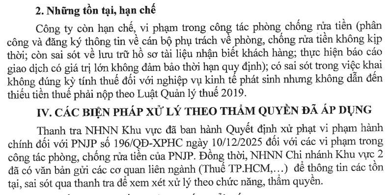 Tuy nhiên, trong quá trình kiểm tra, cơ quan thanh tra đã chỉ ra một số tồn tại và vi phạm, tập trung chủ yếu ở công tác phòng, chống rửa tiền. Cụ thể, việc phân công và đăng ký thông tin cán bộ phụ trách lĩnh vực này chưa được thực hiện đầy đủ, kịp thời theo quy định. Bên cạnh đó, hồ sơ, tài liệu phục vụ công tác nhận biết và xác minh thông tin khách hàng còn phát sinh sai sót trong khâu lưu trữ.