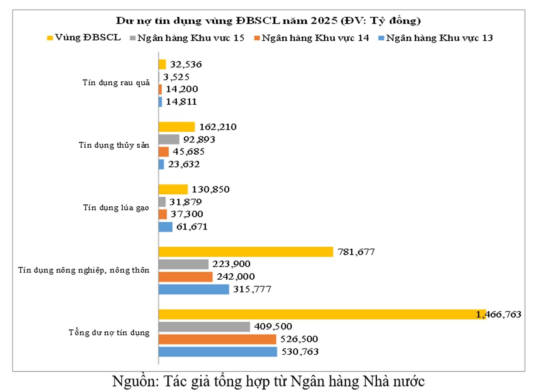 Những năm gần đây, hệ thống ngân hàng đã duy trì ưu tiên cao đối với tín dụng phục vụ nông nghiệp, nông thôn và nông dân. Riêng tại khu vực ĐBSCL, tín dụng nông, lâm, thủy sản luôn chiếm tỷ lệ đáng kể trong tổng dư nợ. Đến cuối năm 2025, tại khu vực do Ngân hàng Nhà nước chi nhánh Khu vực 14 quản lý, tổng dư nợ cho vay đạt hơn 522.000 tỷ đồng, tăng trên 14% so với cuối năm trước; trong đó, dư nợ cho vay nông, lâm, thủy sản chiếm gần 16% tổng dư nợ toàn khu vực. Đây là tỷ lệ cao so với mặt bằng chung cả nước, phản ánh vai trò trung tâm của nông nghiệp trong cơ cấu kinh tế vùng.