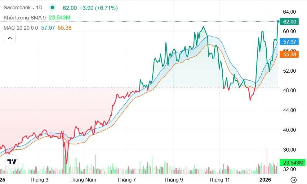 Đà tăng mạnh đưa thị giá STB vọt lên 62.100 đồng/cổ phiếu, mức cao nhất từ trước đến nay. Chỉ trong hơn một tháng, cổ phiếu này đã tăng gần 35%, qua đó đẩy vốn hóa Sacombank lên khoảng 117.000 tỷ đồng – một kỷ lục mới.