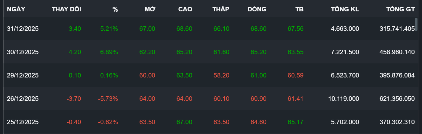 Nếu lấy mốc đóng cửa 26/12 (60.900 đồng/cp) làm điểm tham chiếu và so với giá giao dịch khoảng 10h00 ngày 31/12 (68.600 đồng/cp), chênh lệch là +7.700 đồng/cp. Với quy mô nắm giữ của gia đình Chủ tịch, mức tăng này nhanh chóng chuyển hóa thành hàng trăm tỷ đồng “phục hồi” về mặt giá trị thị trường.