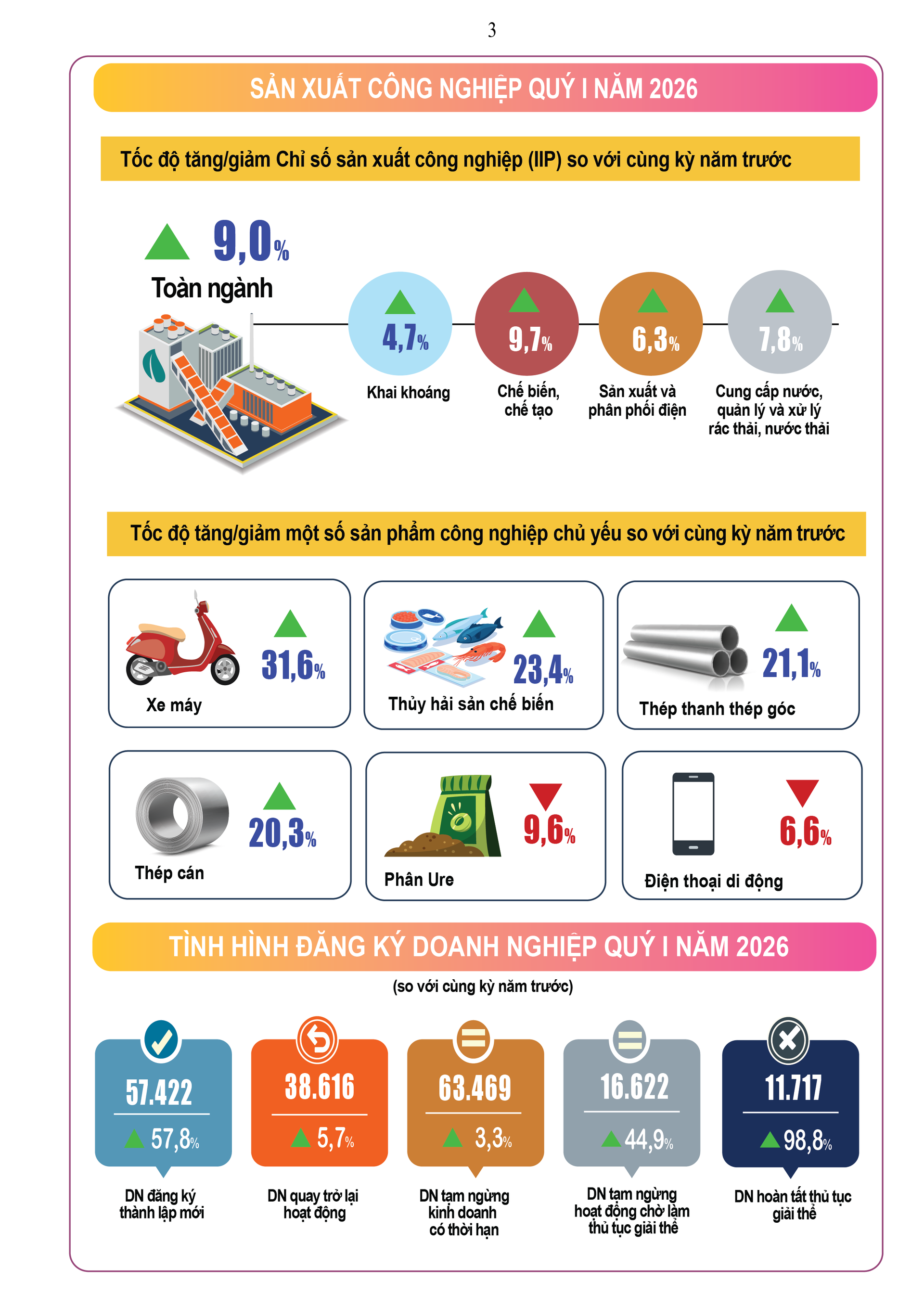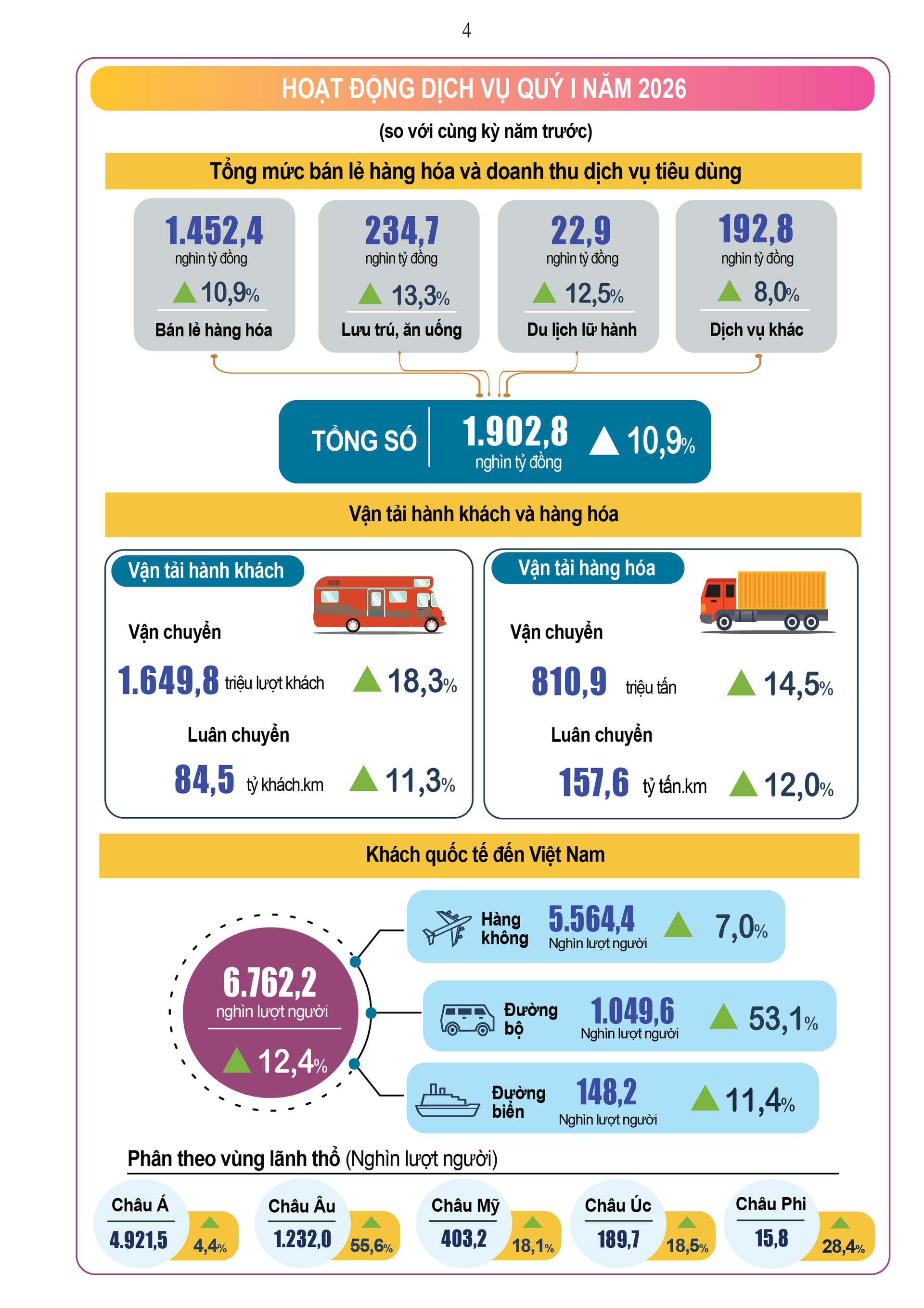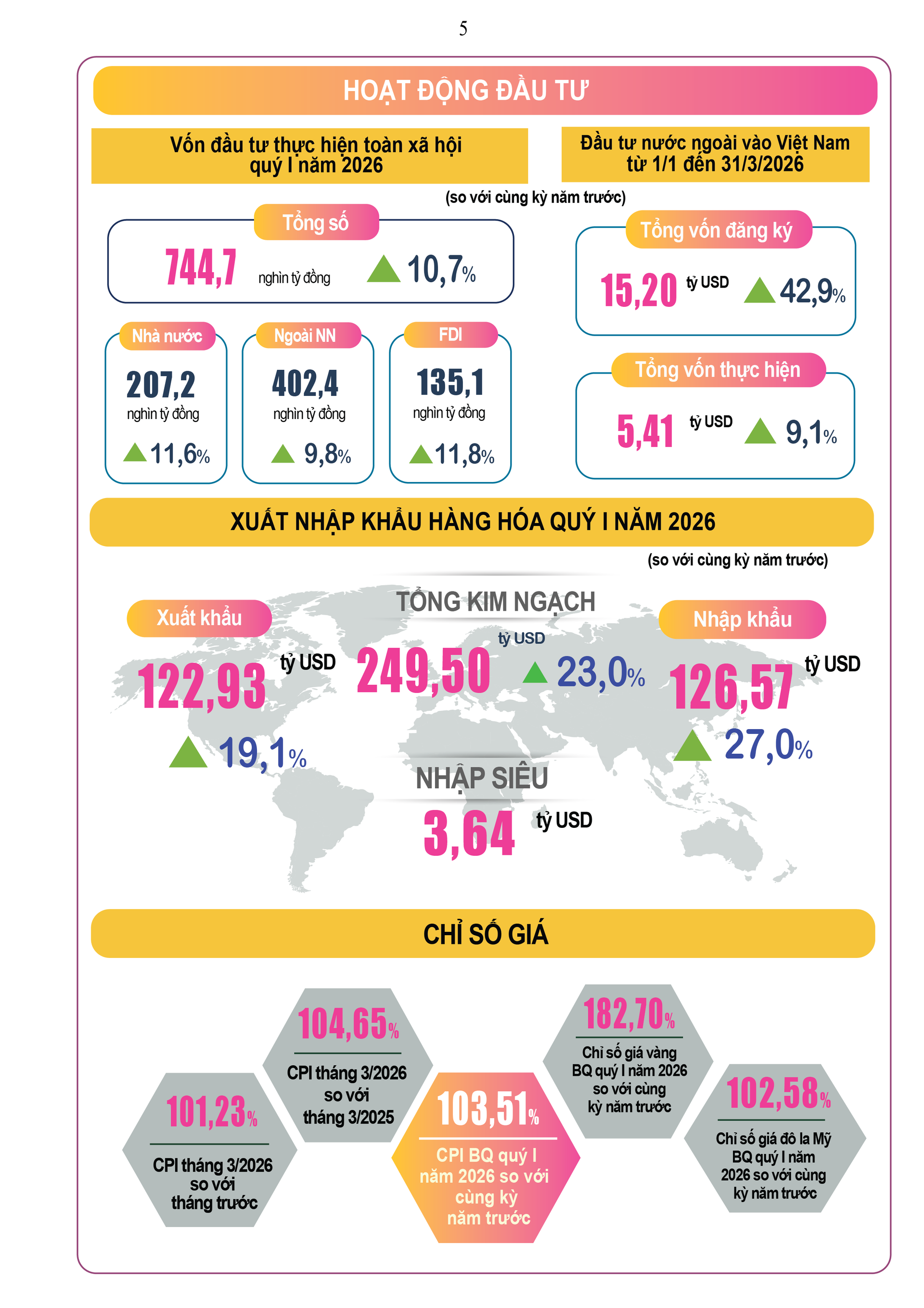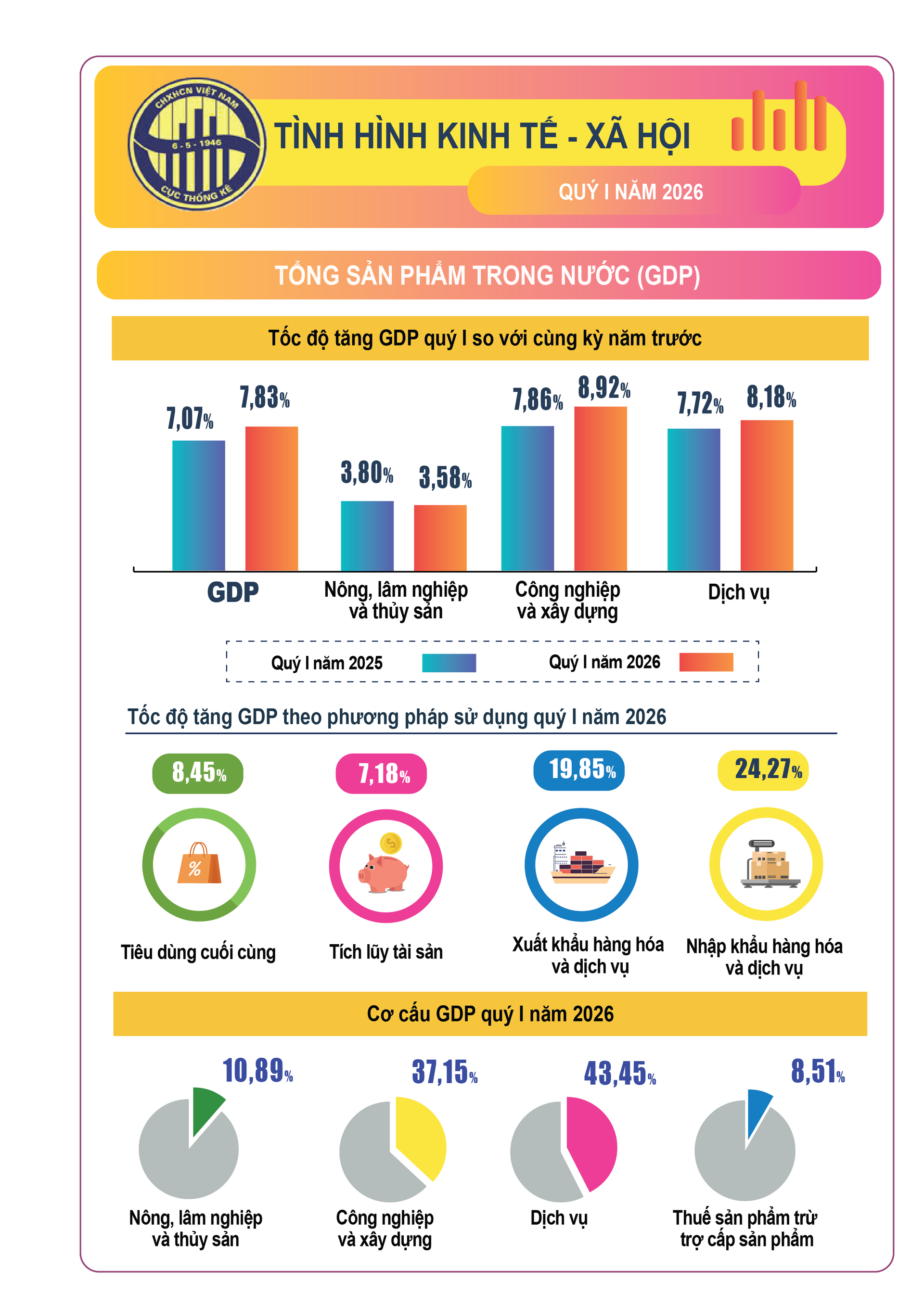 (Banker.vn) Số liệu về tình hình kinh tế - xã hội quý I/2026 của Cục Thống kê cho thấy nhiều tín hiệu tích cực như: tốc độ tăng trưởng GDP tăng tăng 7,83% so với cùng kỳ năm trước, tổng vốn đầu tư nước ngoài (FDI) vào Việt Nam đạt 15,20 tỷ USD, tăng 42,9%; tổng kim ngạch xuất, nhập khẩu hàng hóa đạt 249,50 tỷ USD, tăng 23%; tổng lượng khách quốc tế đến Việt Nam đạt 6.762,2 nghìn lượt, tăng 12,4%…