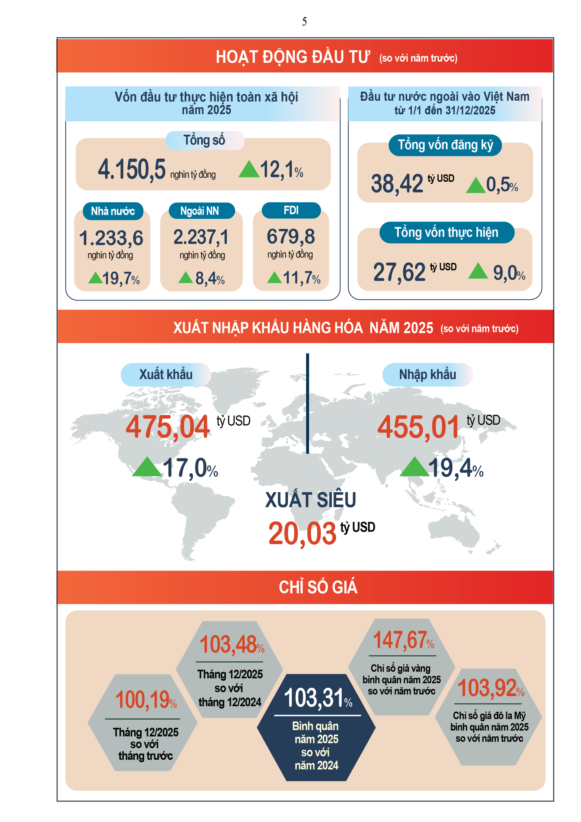 (Banker.vn) Số liệu về tình hình kinh tế - xã hội năm 2025 của Cục Thống kê cho thấy nhiều tín hiệu tích cực như: tổng sản phẩm trong nước (GDP) đạt 8,02%; tổng vốn đầu tư nước ngoài vào Việt Nam đạt 38,42 tỷ USD, tăng 0,5% so với năm trước; tổng kim ngạch xuất, nhập khẩu hàng hóa đạt 930,05 tỷ USD, xuất siêu đạt 20,03 tỷ USD so với năm trước; tổng lượng khách quốc tế đến Việt Nam đạt 21.168,3 nghìn lượt, tăng 20,4%…