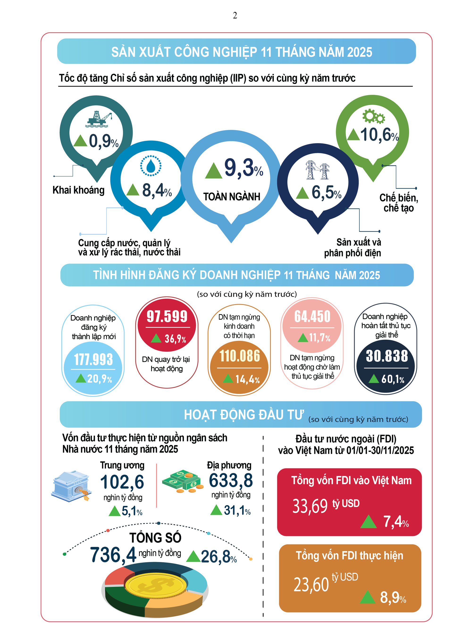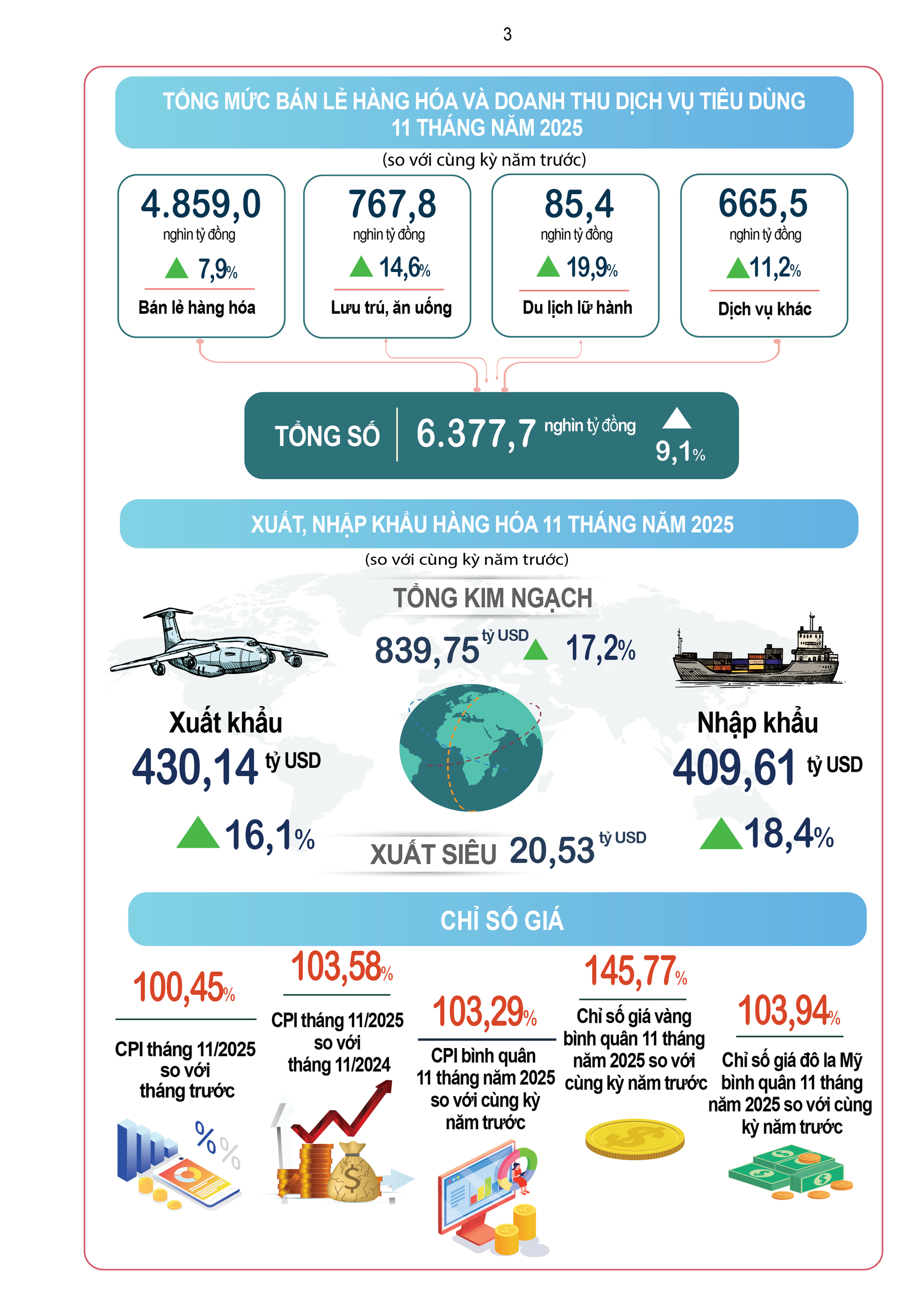 (Banker.vn) Số liệu về tình hình kinh tế - xã hội 11 tháng năm 2025 của Cục Thống kê cho thấy nhiều tín hiệu tích cực như: tổng vốn đầu tư nước ngoài vào Việt Nam đạt 33,69 tỷ USD, tăng 7,4% so với cùng kỳ năm trước; tổng kim ngạch xuất, nhập khẩu hàng hóa đạt 839,75 tỷ USD, tăng 17,2% so với cùng kỳ năm trước; tổng lượng khách quốc tế đến Việt Nam đạt 19.146,7 nghìn lượt, tăng 20,9%…