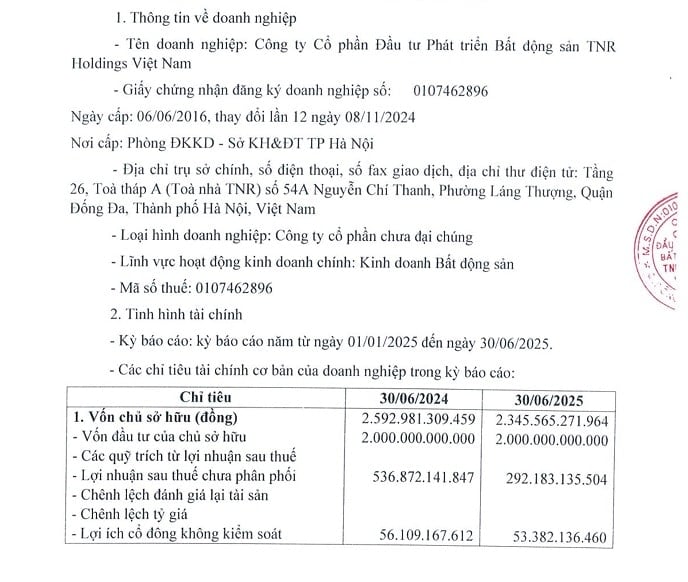 Công ty CP Đầu tư Phát triển Bất động sản TNR Holdings Việt Nam vừa gửi Sở Giao dịch Chứng khoán Hà Nội báo cáo tài chính bán niên, ghi nhận lỗ sau thuế 167,1 tỷ đồng trong 6 tháng đầu năm 2025. So với mức lãi 16,58 tỷ đồng cùng kỳ năm trước, kết quả này đánh dấu sự suy giảm mạnh mẽ. Lợi nhuận trước thuế cũng âm hơn 160 tỷ đồng, đảo chiều hoàn toàn so với con số dương 19,7 tỷ đồng ghi nhận nửa đầu năm 2024.<#p>